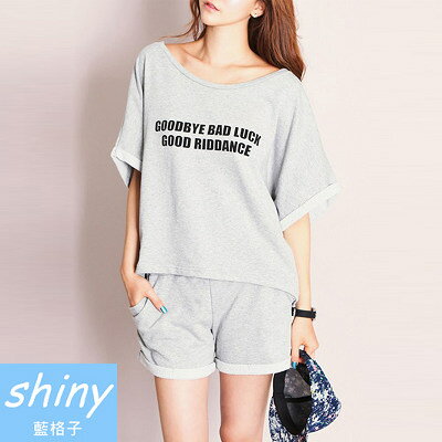 ~399超商免運 599折30 輸入代號 M7OJ-IPQJ-ZB18-R5YO【V8091】shiny藍格子-甜心休閒.字母圓領寬鬆上衣短褲兩件式套裝
